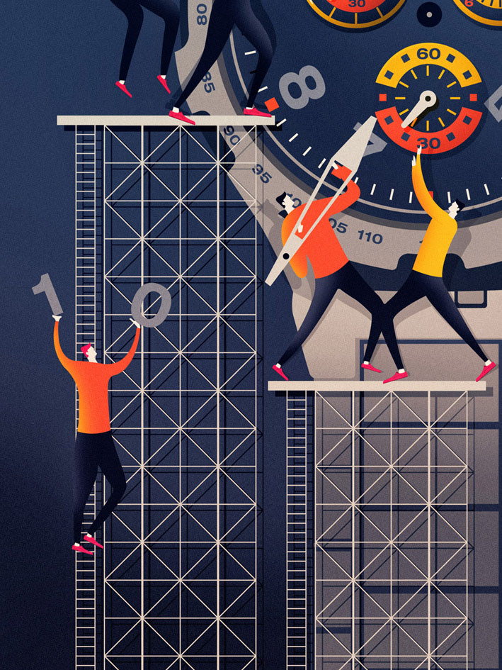 Inspired by a recent purchase of a Swatch watch, I loved the small details and colour palette of the design I thought it would lend itself really well to my style of illustration. So in between commissions i would wonder how the whole time piece was built, so I created this interpretation of a team of builders/designers bringing all the elements together to create one unique product.